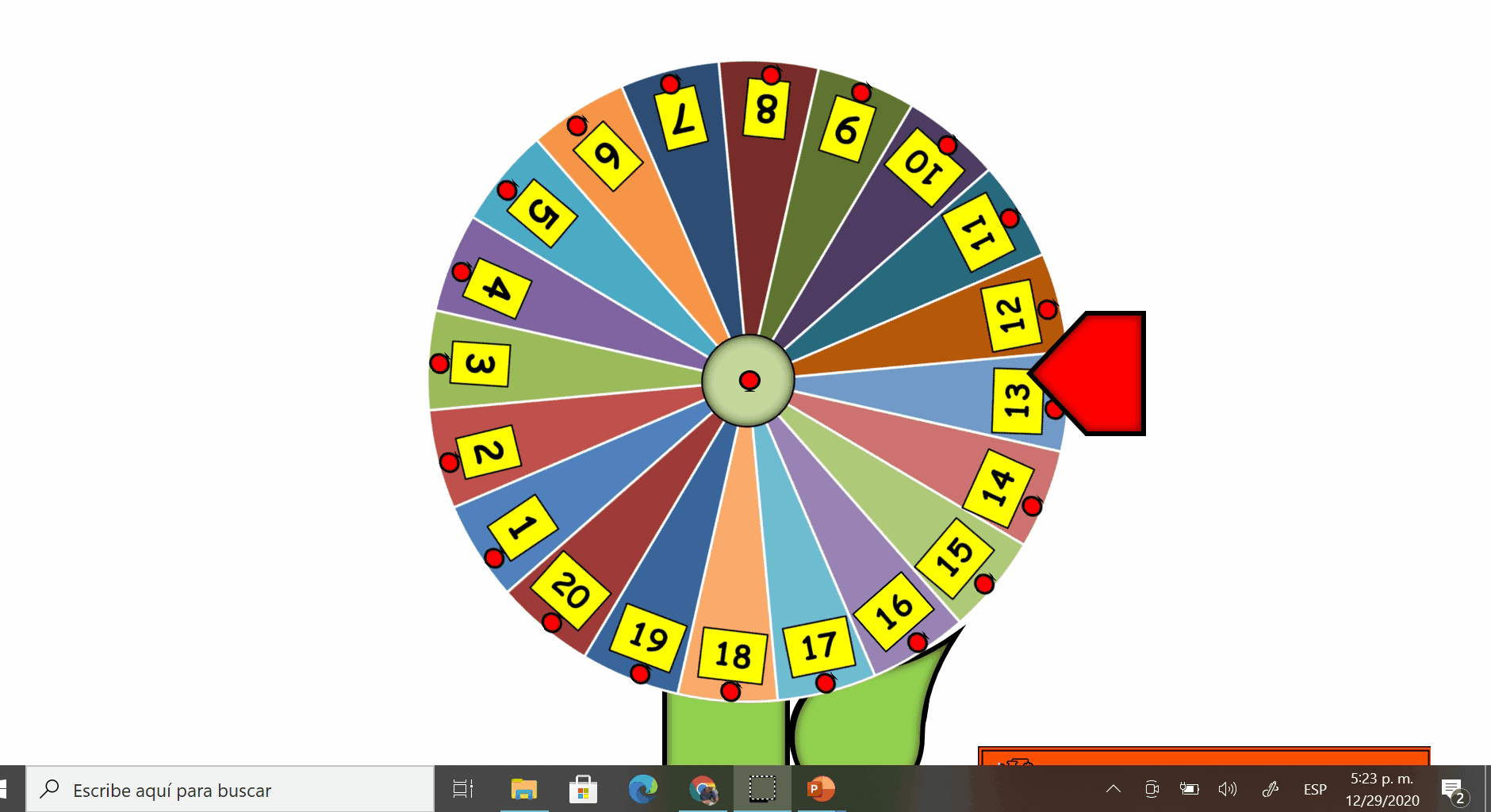 Ruleta interactiva con los números del 1-20. Ideal para asignar turnos o para integrarla a juegos durante las clases virtuales. Disponible en formato powerpoint lista para utilizar. Solo descargue y utilice la ruleta cuantas veces quiera. La descarga es gratis por tiempo limitado. ¡Descargue este recurso hoy mismo!